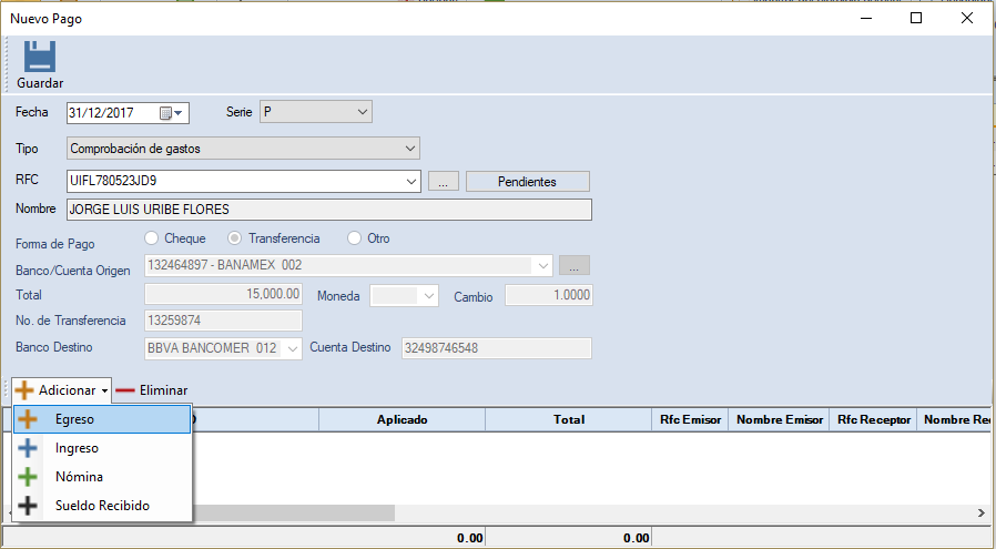 Para adicionar el o los comprobantes en la comprobación de un gasto da clic en "Adicionar". Te mostrará una lista con 4 tipos de comprobantes. Selecciona el correspondiente: