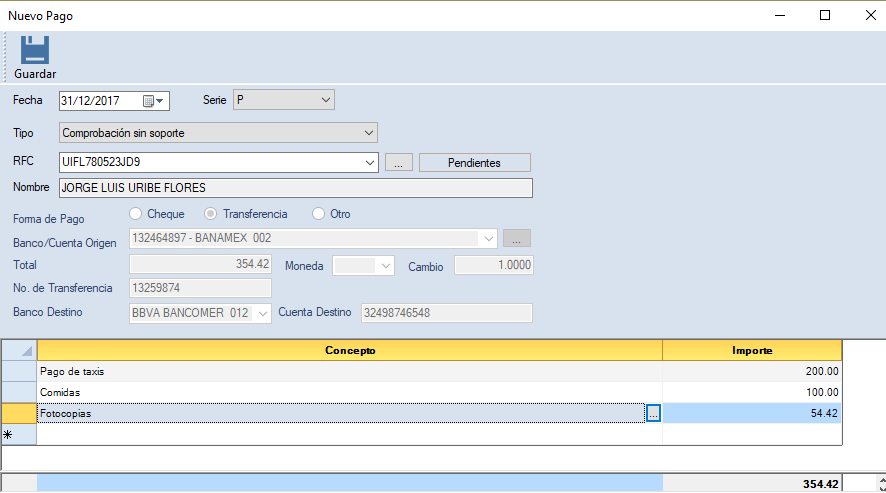 Una vez capturados los conceptos, se mostrará el total, el cuál coincide, en este ejemplo, con la comprobación sin soporte. Da clic en "Guardar".