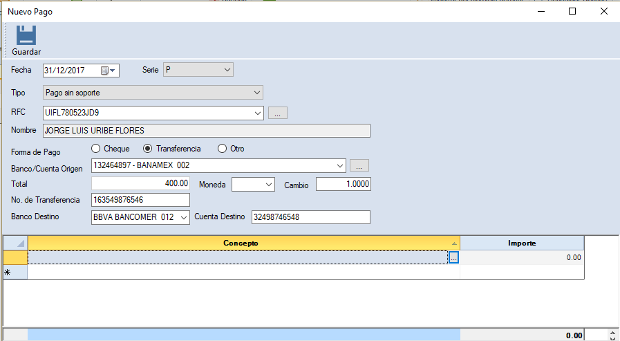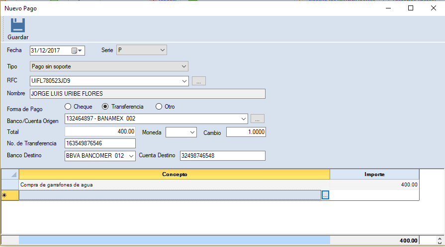 Una vez capturados los conceptos, se mostrará el total, el cuál coincide, en este ejemplo, con el pago sin soporte. Da clic en "Guardar".