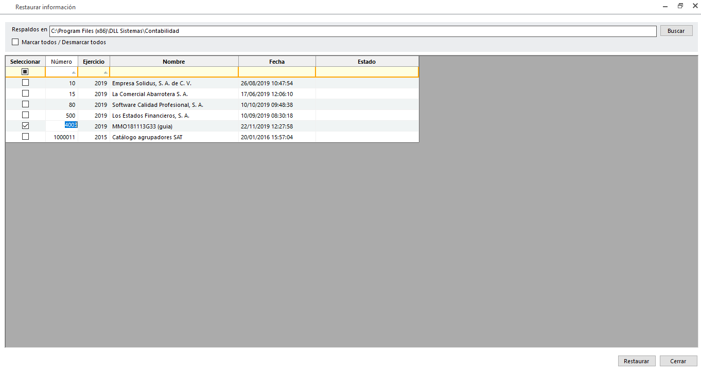 El número de empresa lo deberás realizar al momento de restaurar empresa. Da doble clic sobre el número de empresa para volverlo editable.