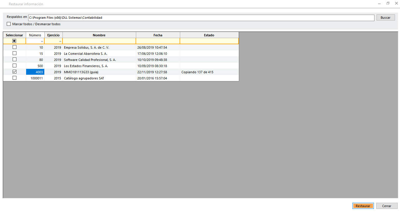 Captura el nuevo número de empresa y da un clic en "Restaurar".