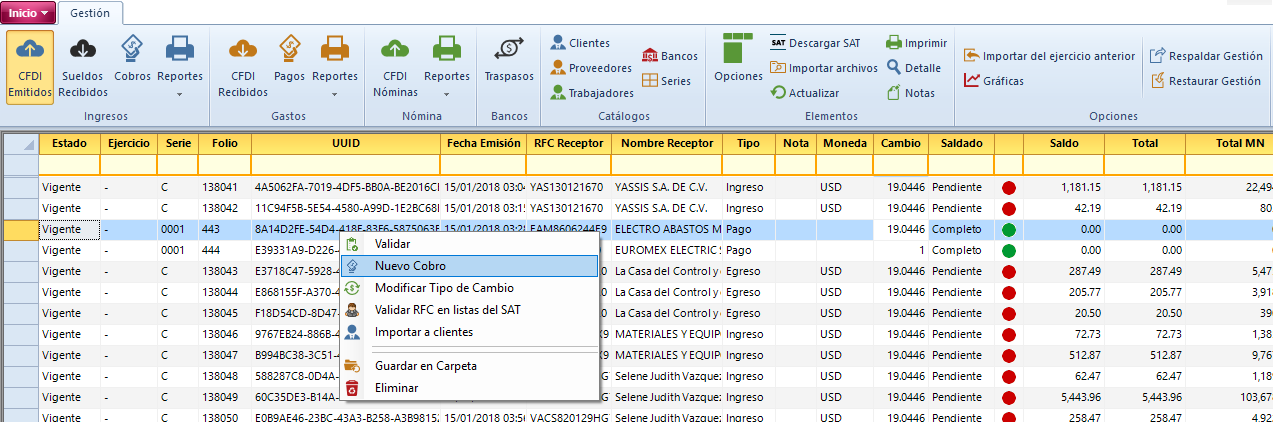 Selecciona el complemento de pago correspondiente, da clic con botón derecho del mouse, selecciona "Nuevo Cobro":