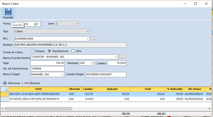 El sistema llamará automáticamente las facturas que se encuentren relacionadas con el complemento de pago. Si la factura relacionada no existe se mostrará un mensaje indicando que no se encuentran, listando los UUID faltantes. Da clic en guardar. Las facturas relacionadas se mostrarán cobradas.