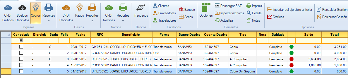 Al guardar cobro sin soporte del ingreso, el ingreso a comprobar en la columna "Saldado" indicará que está completo , si se comprobó al 100%.