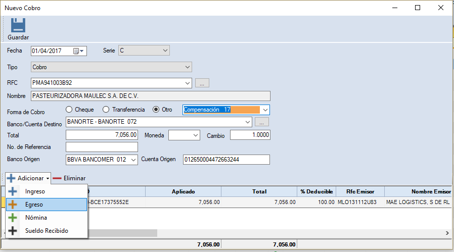 Captura el importe total coloca cero si las facturas con las que compensarás son mayores al importe de la factura de ingreso. Cuando el importe cobrado, es mayor a las facturas, captura solamente el importe correspondiente a la factura de ingresos. El sobrante podrás capturarlo en un nuevo cobro como un cobro sin soporte o un ingreso a comprobar.