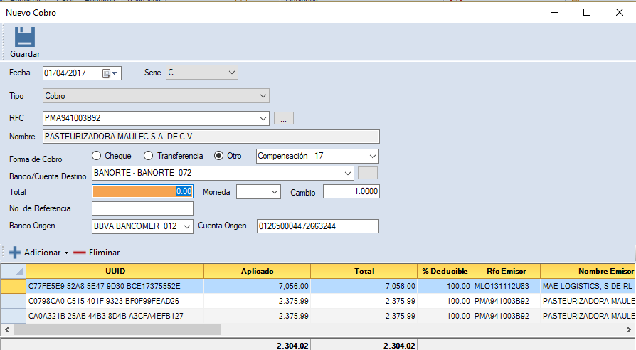 Al no haber ni entrada ni salida de dinero en "Total" se coloca cero. La cantidad pendiente de la factura de ingresos se puede cobrar o compensar, según sea el caso.