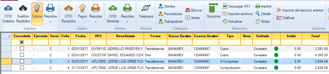 Con esta opción podrás realizar la comprobación de los ingresos a comprobar. Por ejemplo, si se recibió el pago de un tercero, al que a su vez le pagaron uno o varios clientes, y ya existen las facturas.