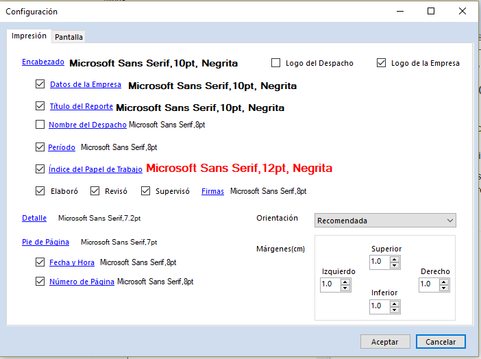 Impresión: Aquí podrás habilitar o deshabilitar la información que deberá o no salir en los reportes.