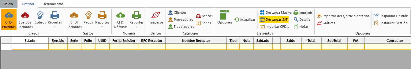 Dentro de la pestaña "Gestión", da clic sobre cualquiera de los apartados de ingresos, gastos o nómina. A continuación da un clic en el botón "Descargar SAT", que se encuentra en el apartado "Elementos".