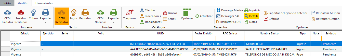 Selecciona la factura electrónica para visualizar su información y da clic en el botón "Detalle":