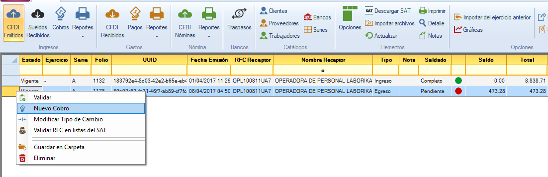 Selecciona la nota de crédito a la que deberás aplicar la devolución . Da clic en el botón "Nuevo Cobro".