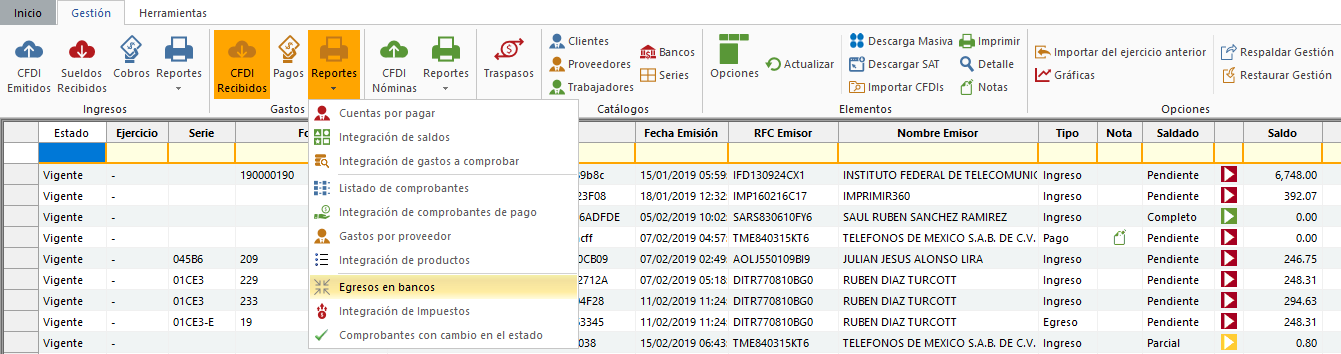 En egresos da clic en "Reportes" y selecciona "Egresos en bancos".