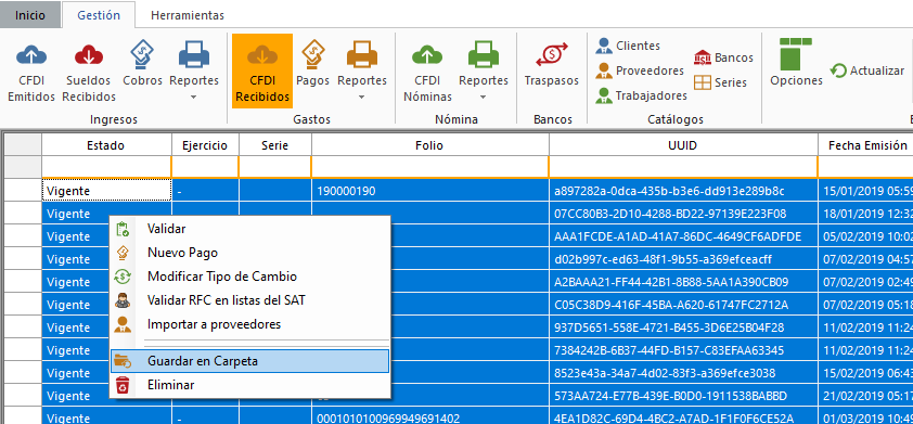 Selecciona los XML que necesites guardar en una carpeta. Selecciona "Guardar en carpeta".