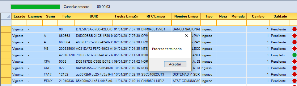 ![]() Da clic en "Aceptar" para iniciar el proceso. Al concluir te mostrará "Proceso terminado", da clic en "Aceptar".