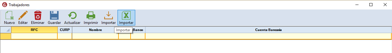 Con esta opción podrás importar, masivamente, el catálogo de trabajadores. Da clic sobre el botón "Importar" (icono de Excel):