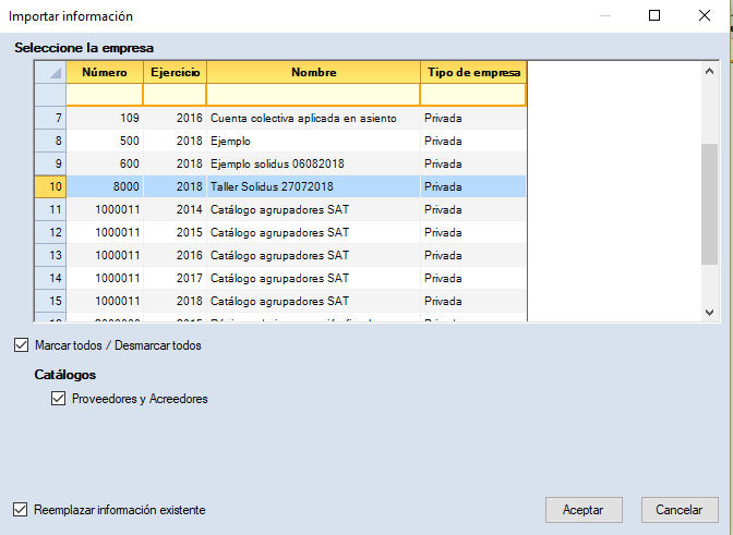 Selecciona la empresa desde la cual vas a importar el catálogo de proveedores. Opcionalmente podrás "Reemplazar información existente", es decir, borrar lo que ya tenías capturado. Para finalizar da clic en "Aceptar".