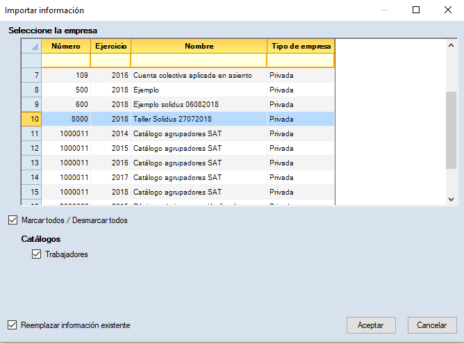 Selecciona la empresa desde la cual vas a importar el catálogo de trabajadores. Opcionalmente podrás "Reemplazar información existente", es decir, borrar lo que ya tenías capturado. Para finalizar da clic en "Aceptar".