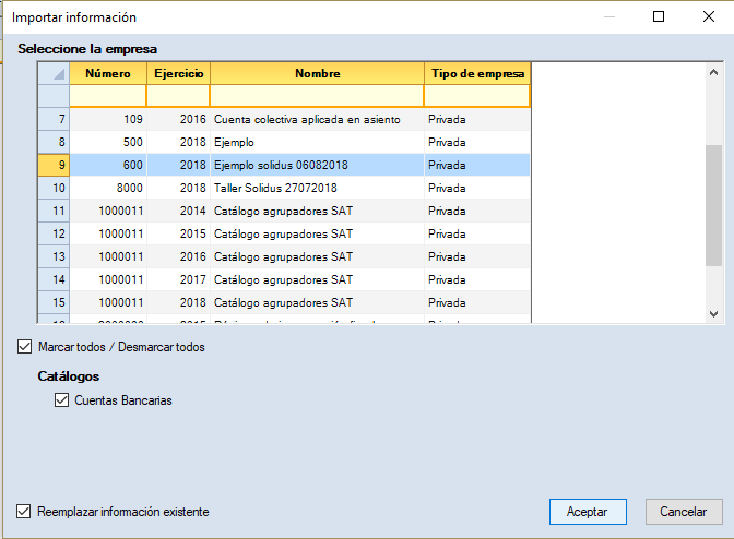 Selecciona la empresa desde la cual vas a importar el catálogo de bancos. Opcionalmente podrás "Reemplazar información existente", es decir, borrar lo que ya tenías capturado. Para finalizar da clic en "Aceptar".