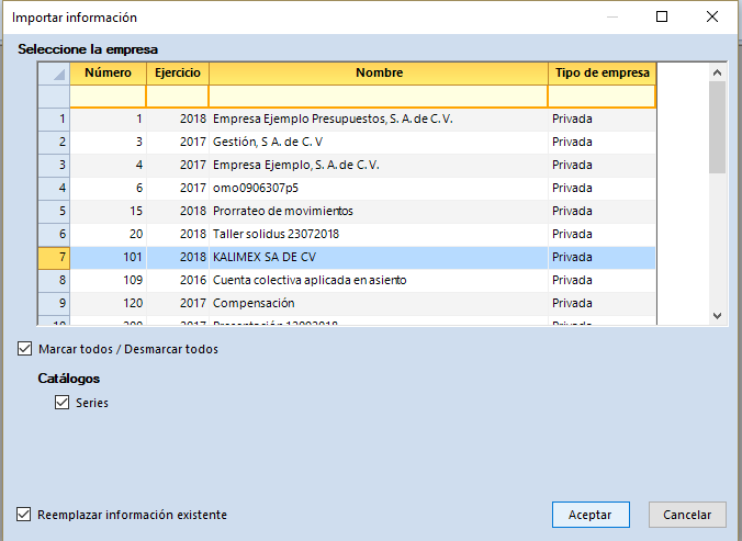 Selecciona la empresa desde la cual vas a importar el catálogo de series. Opcionalmente podrás "Reemplazar información existente", es decir, borrar lo que ya tenías capturado. Para finalizar da clic en "Aceptar".