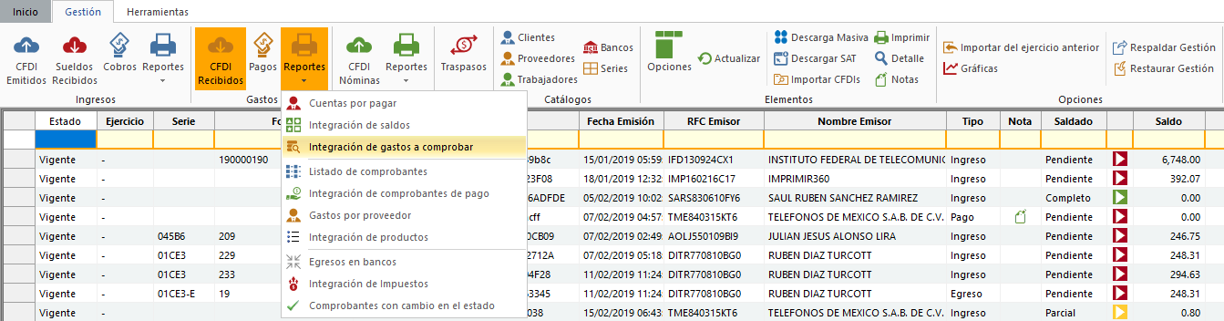 En egresos da clic en "Reportes" y selecciona "Integración de egresos a comprobar".