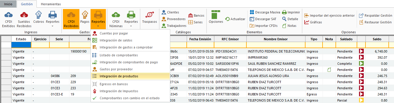En egresos da clic en "Reportes" y selecciona "Integración de productos".