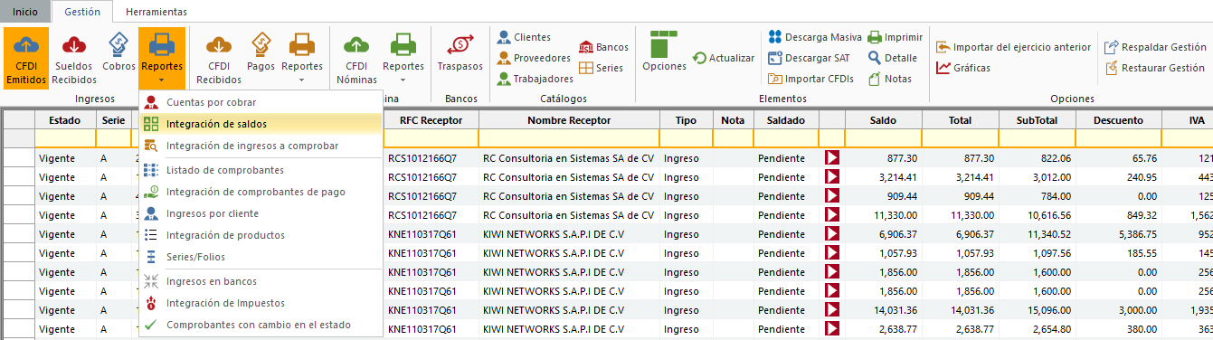 En ingresos da clic en "Reportes" y selecciona "Integración de saldos".