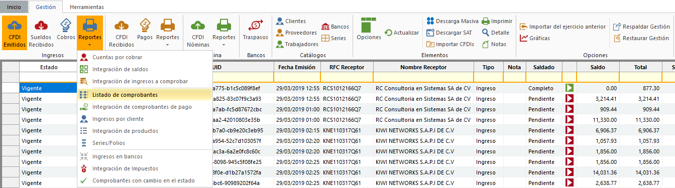 En ingresos da clic en "Reportes" y selecciona "Listado de comprobantes".