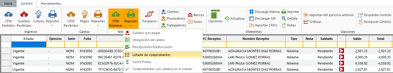 En nómina da clic en "Reportes" y selecciona "Listado de comprobantes".