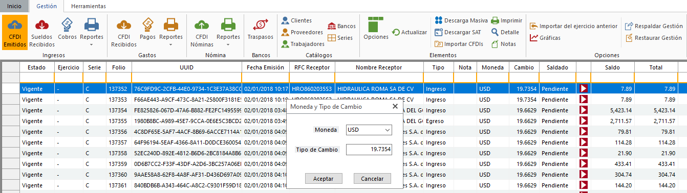 Puedes seleccionar varias facturas a la vez, siempre y cuando aplique el mismo tipo de cambio a todas. Utiliza la combinación de teclas: ctrl + clic