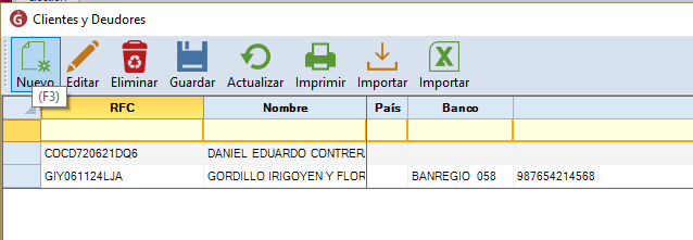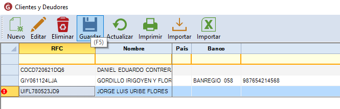 Se habilitará un renglón en la parte de abajo. Coloca el RFC del deudor, optativamente, captura la cuenta bancaria y selecciona del catálogo de bancos el que corresponda. Para finalizar da clic en "Guardar":