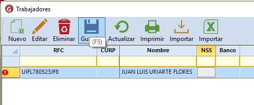 Se habilitará un renglón en la parte de abajo. Coloca el RFC del trabajador, optativamente, captura la cuenta bancaria y selecciona del catálogo de bancos el que corresponda. Para finalizar da clic en "Guardar":