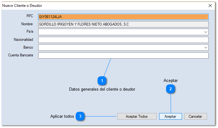 Si no cuenta el sistema con el cliente o deudor te mostrará una ventana para indicar los datos y agregarlo al catálogo de "Clientes".