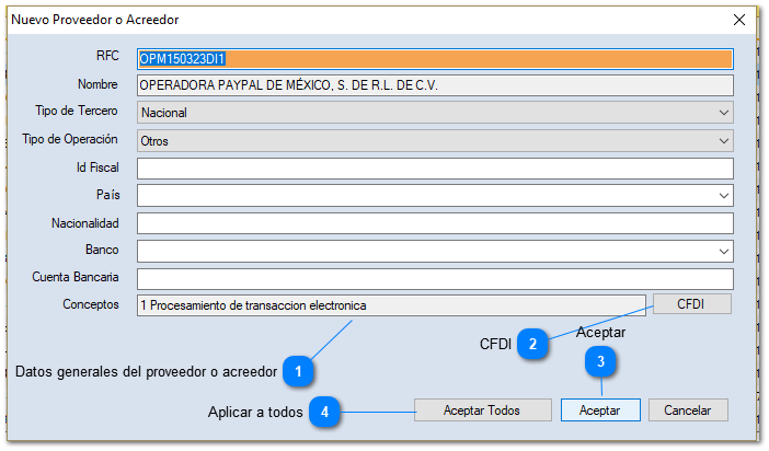 Si no cuenta el sistema con el proveedor o acreedor te mostrará una ventana para indicar los datos y agregarlo al catálogo de "Proveedores".