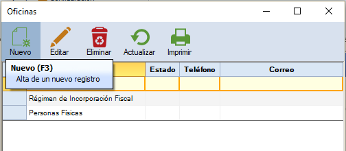 Selecciona "Nuevo" y captura todos los datos correspondientes a la oficina o sucursal.
