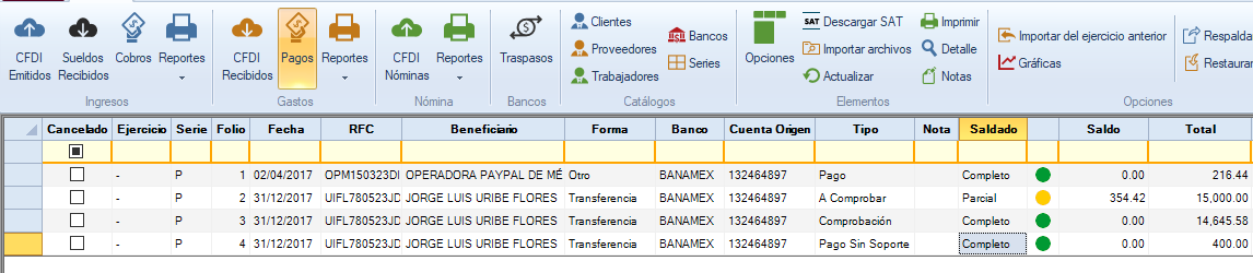 Al guardar pago sin soporte del ingreso, el ingreso a comprobar en la columna "Saldado" indicará que está completo , si se comprobó al 100%.