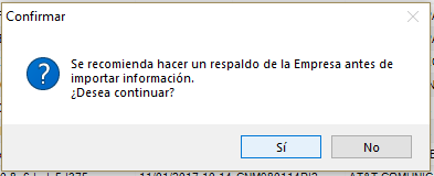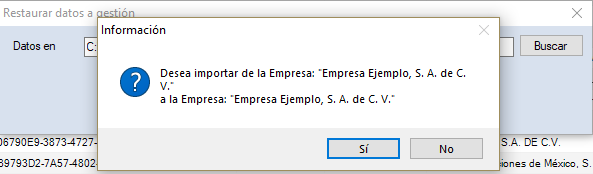 Al dar clic en "Importar" te mostrará una ventana con el nombre de la empresa que vas a importar a Gestión. Indica "Sí" para iniciar el proceso.