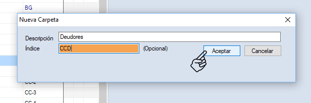 Dentro del legajo selecciona el lugar donde quieres agregar el archivo o carpeta. Da clic con el botón derecho del mouse y selecciona del menú "Carpeta". En el ejemplo se requiere agregar una carpeta, adicional, dentro de la carpeta "Cartas de circularización".