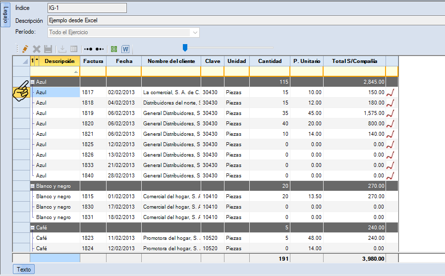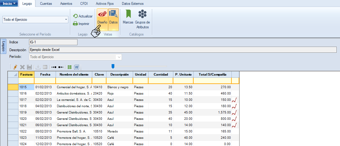 Se tiene la opción de agrupar la información de la tabla de datos para otro tipo de análisis. En el siguiente ejemplo se desea agrupar por colores, es decir por la "Descripción". Da clic en vistas "Diseño".