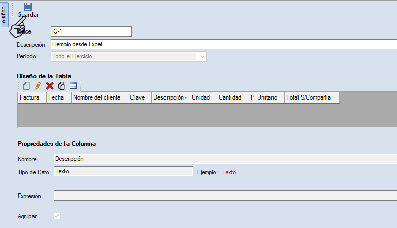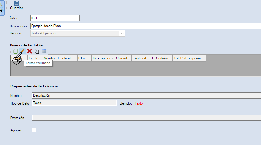 Te permitirá editar la información de las columnas. Para el ejemplo, se selecciona la columna "Descripción". Da clic en "Editar Columna".