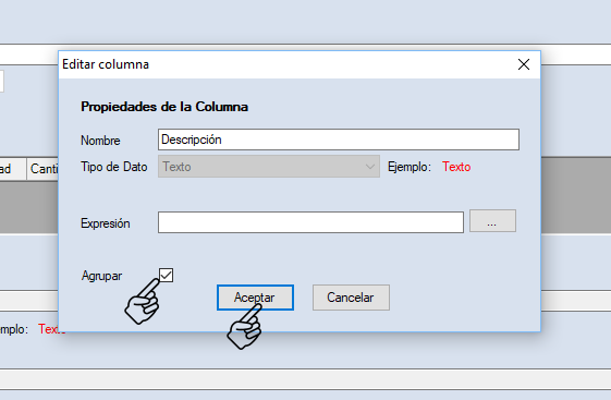 Te mostrará la ventana para editar algunos elementos. En ella habilita "Agrupar" y da clic en "Aceptar".