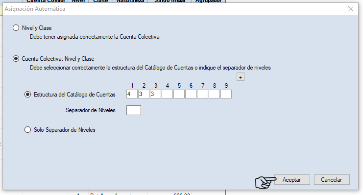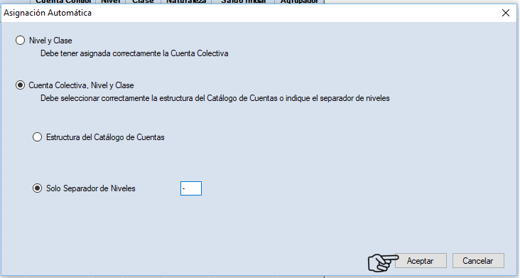 La segunda es indicando si tiene un separador de niveles, es decir, tal vez no tiene una estructura lógica el catálogo de cuentas pero si existe un separador de niveles, por ejemplo un punto o un guión medio. Se indicará el separador de niveles para realizar el procedimiento correspondiente.