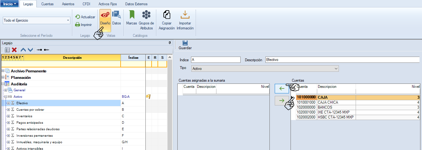 Para poder asignar las cuentas en la sumaria selecciona la "Vistas" “Diseño”. Para integrar la o las cuentas se deben seleccionar, y posteriormente con la flecha que apunta a la izquierda, enviarla a “Cuentas asignadas a la sumaria” que corresponda.