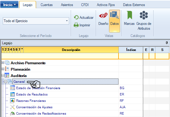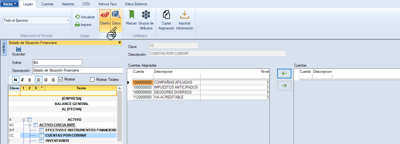 Al cambiar la vista a “Diseño” al lado derecho del legajo presenta la estructura del estado financiero.