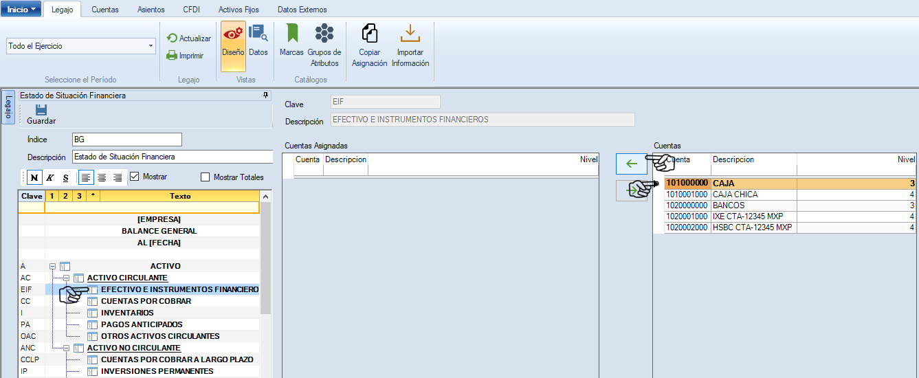 Para realizare la asignación selecciona, con un clic, el rubro correspondiente, en el ejemplo “EFECTIVO E INSTRUMENTOS FINANCIEROS”. Una vez seleccionado el rubro, da clic al lado izquierdo de la cuenta o cuentas que deben integrarlo , y posteriormente con la flecha que apunta a la izquierda dar clic para enviarla a “Cuentas Asignadas”.