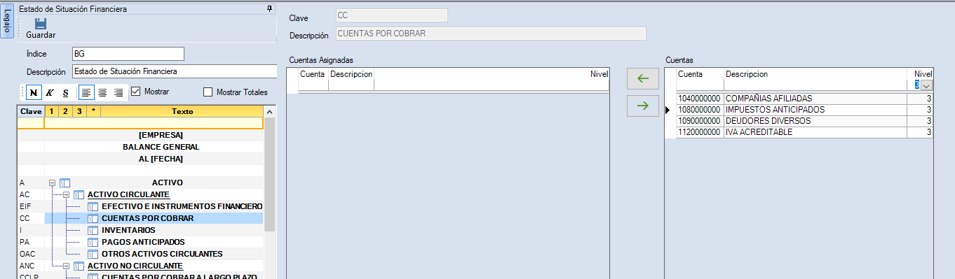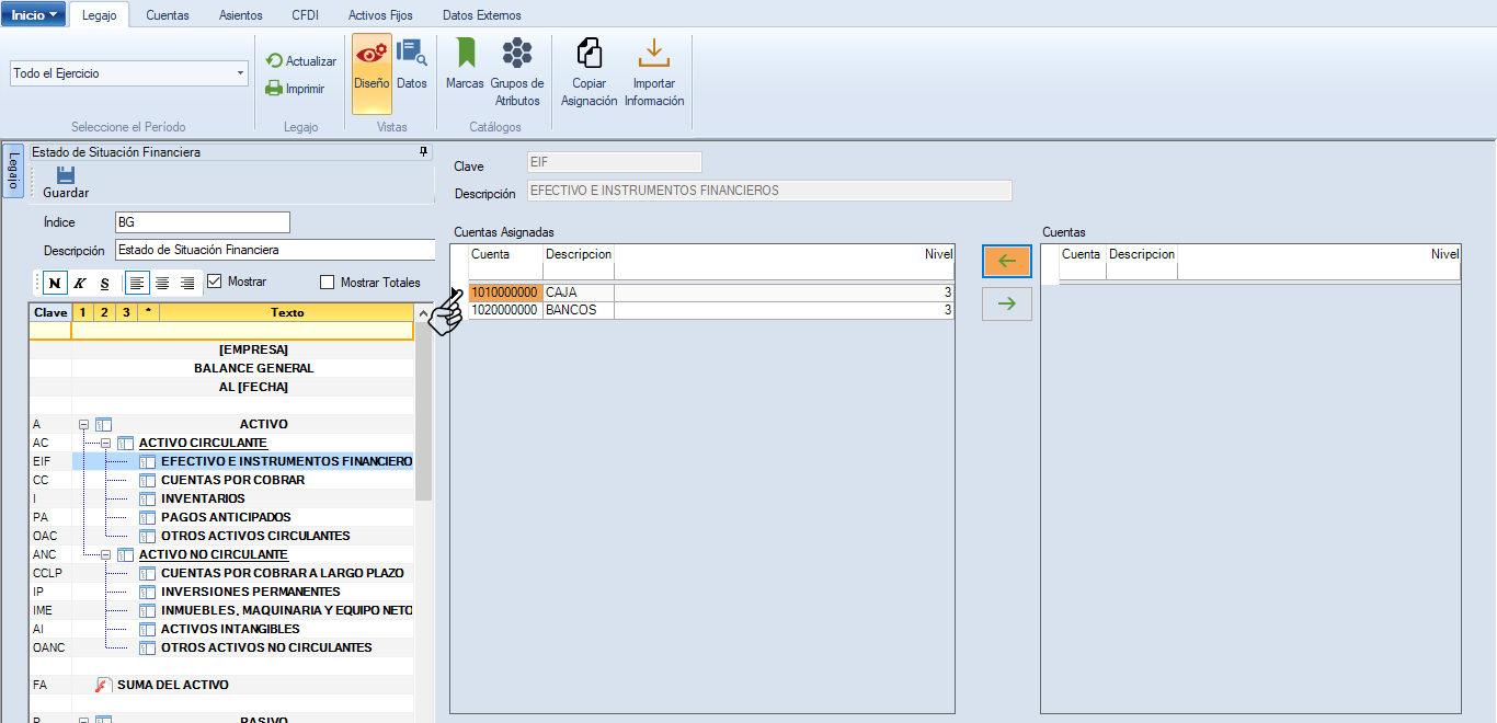 Se debe seleccionar la cuenta de mayor o en su caso las cuentas de registro que integrarán el rubro correspondiente. No se deben seleccionar las cuentas de control y de detalle al mismo tiempo, ejemplo: solo se debe seleccionar la cuenta 1020000000 BANCOS, sus cuentas de detalle NO, si se hace se duplicará el importe en el estado financiero. O si seleccionan las cuentas de detalle para presentarlas en el estado la cuenta de control NO debe ser seleccionada.