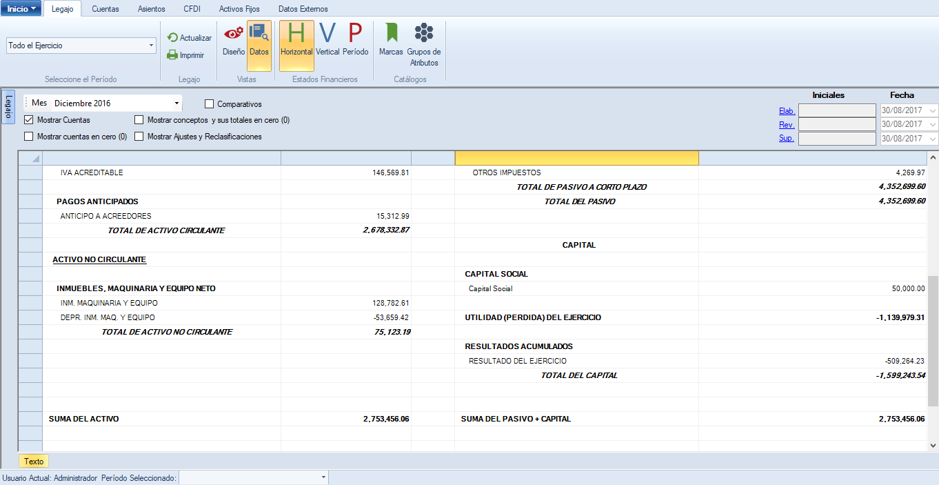 El estado financiero aparece ya con los datos asignados al periodo seleccionado.