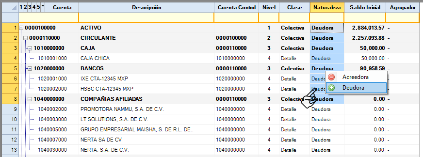 Para dar naturaleza a las cuentas se deberá seleccionar el grupo de cuentas botón derecho del mouse y presentará “Acreedora” o “Deudora”. Selecciona la opción correcta. Si la importación trae ya la naturaleza no es necesario asignarla nuevamente, pero si revisar que este correcta.