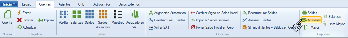Ubica la sección "Reportes". Da clic en "Auxiliares".
