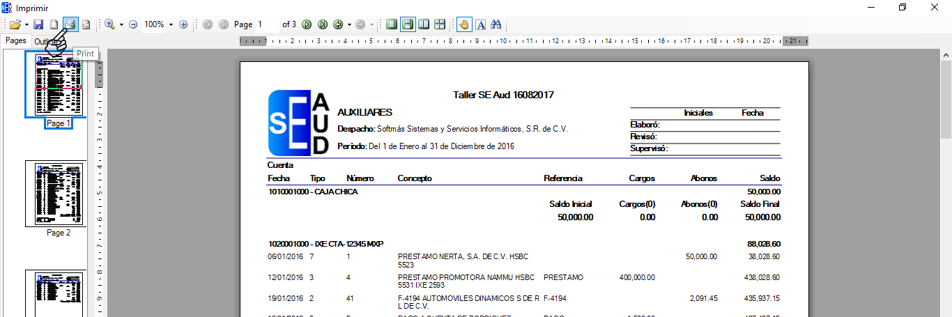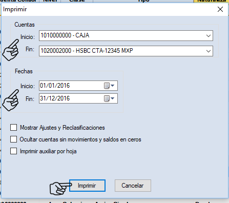Indica la cuenta inicio y la cuenta fin (si no indicas ninguna se tomarán todas las cuentas del catálogo). Selecciona el rango de meses a visualizar. Señala si quieres se muestre con ajustes y reclasificaciones. Marca si quieres imprimir auxiliar por hoja. Da clic en "Imprimir" (Todo reporte primero se visualiza en pantalla antes de imprimirse).