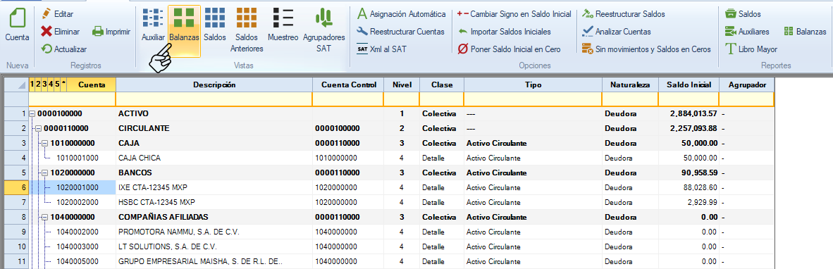 Para ver las balanzas de comprobación. Da clic en "Vistas", "Balanzas".